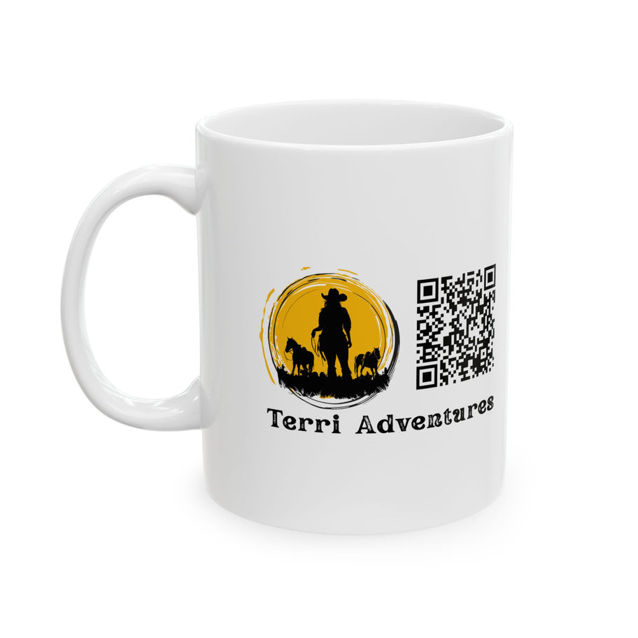 Reach for a warm, honest sip with this glossy ceramic mug that carries a quiet western spirit. A sunlit silhouette of a cowboy and his dog wraps one side, while bold, crisp lettering and a handy QR accent balance the design. The white ceramic makes the colors pop and the comfortable C-handle fits naturally in your hand — whether you’re easing into a slow morning or taking a break between chores. Durable, safe, and low-fuss: it stands up to daily use and keeps that rugged-yet-refined look wash after wash.