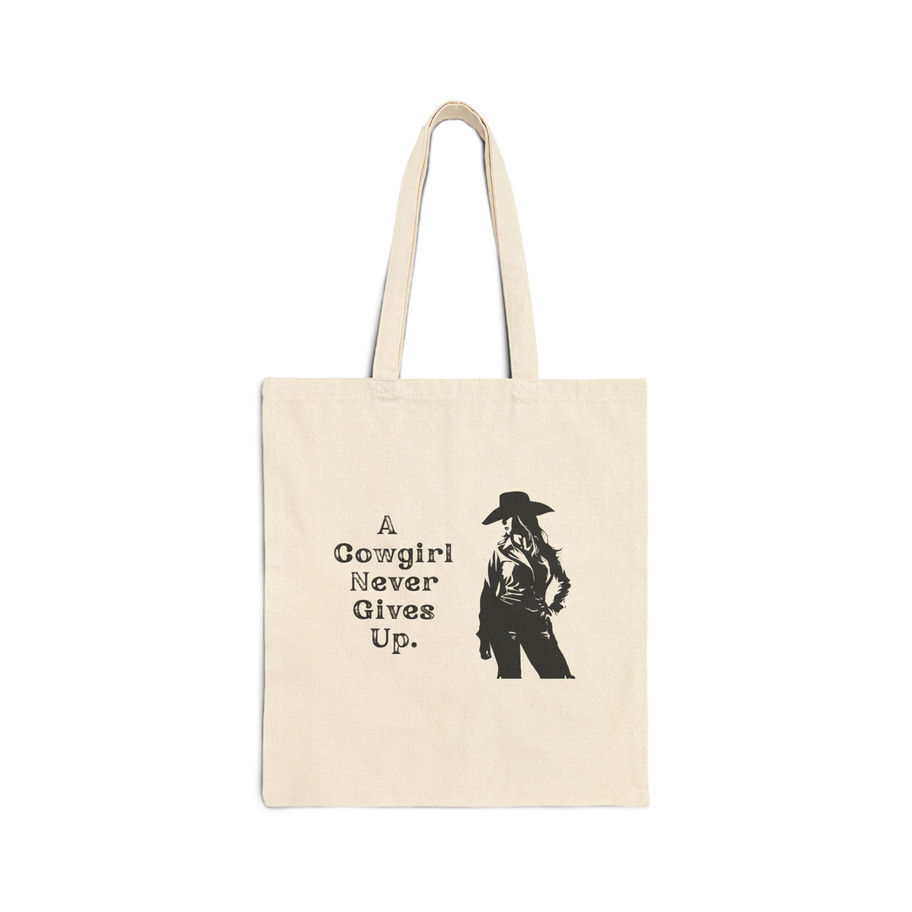 A sturdy cotton canvas tote that carries a quiet, western spirit. The heavy 12 oz fabric feels substantial in your hands and holds its shape while you load it with books, groceries, or gear for a day on the trail. The design evokes sunlit horizons and cowgirl resolve — a silhouetted rider and typewriter-style text that reads like a personal motto. Natural tones and reinforced self-fabric handles keep the look clean and wearable with jeans, boots, or a favorite jacket. Wear it to markets, ranch visits, small road trips, or neighborhood errands and let the bag speak for the resilient, adventurous life you live.